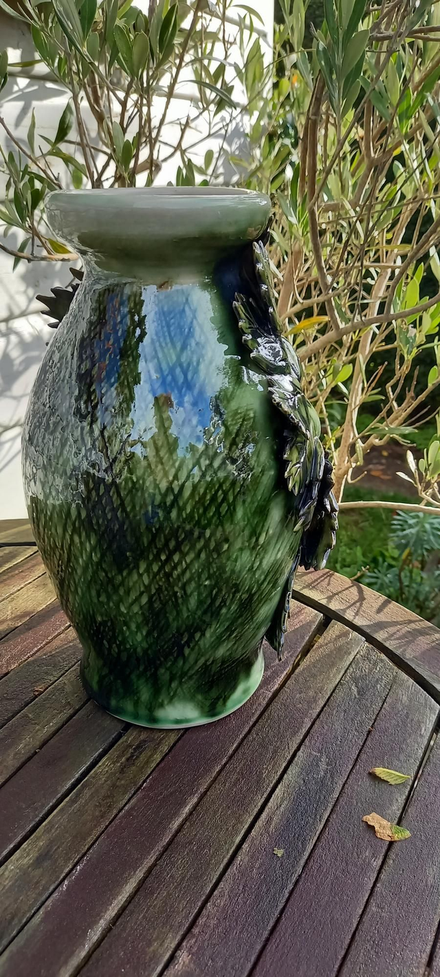 Hand thrown stoneware vase, with green man modelled face. Height 28.5 cms.