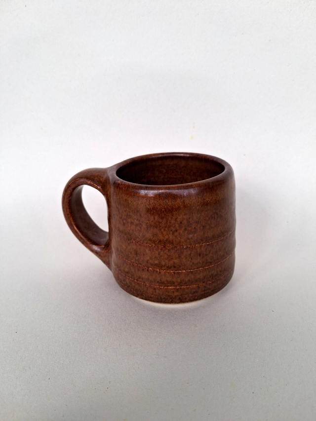Satin brown coffee mug, comfortable in hand, smooth on mouth.
