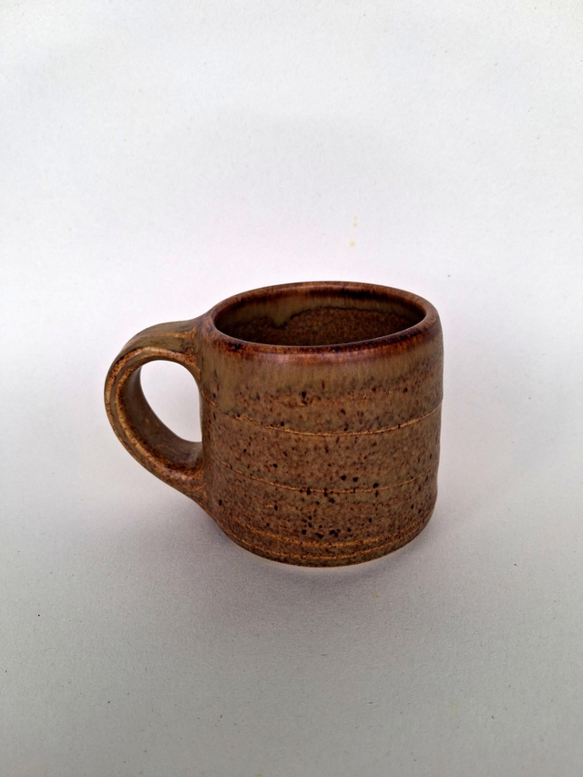 Small satin mustardy coloured mug, good in the hand and in the mouth.